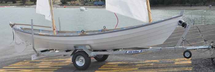I gave a lot of thought to the trailer. I previously have had problems retrieving a boat in waves where a wave lifts the boat off the centre roller and drops it elsewhere, resulting in the plywood being gouged. This happened so frequently that I seemed always to be making repairs. I was determined not to let that happen to this boat. The solution was to use wide rollers and bow guides. The rollers in front of and behind the wheels are aligned with frames of the boat, to minimise stress on the boat.