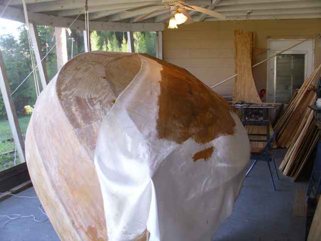 I took a five minute break in the middle of this layer of cloth. It's hard to reach across that hull to the middle of the boat. So I raised it up like a horse lifting a leg to get a stone removed. I finished the epoxy and trimmed the cloth. It's now ready for another coat tomorrow. We are looking at two more days of temps over 70 before lunch. That's just enough time to set the epoxy.