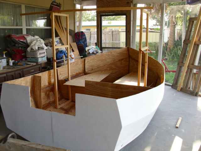 The 2 plywood sheets show where the bunks will be and help for planning the size of the forward cabin. I've got to cut another 18 in. off the height of the bunks base.