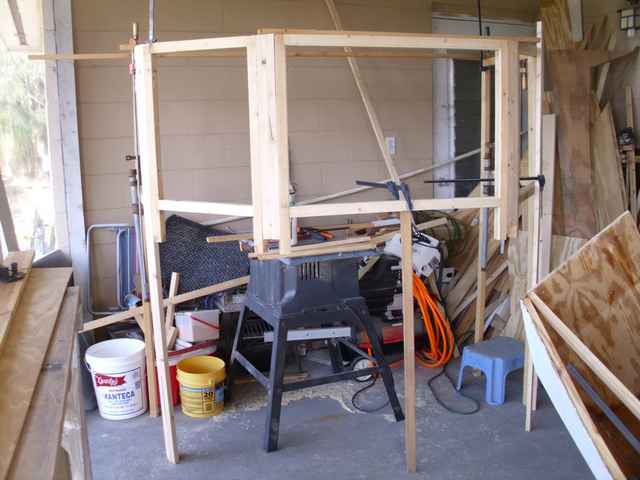 I've followed what Mike said and rolled the hull to the side. That helps with the epoxy runs and my back pain. It was easy to hoist the side with the Harbor Fright block n tackle. Slide a 2x4 under the side and support on a saw horse. This really proved to be quite stable.