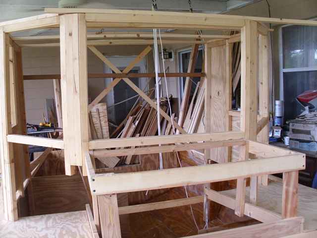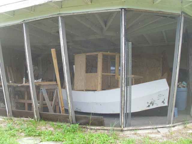 The boats on the front porch with its cabin attached. I've painted the hull blue, for lack of any other acceptable color on hand - oh well. The cabin is in white for now. It's just the under sheeting. I'm going to finish it with bead board in a natural finish. It will look better as the finishing touches are put on. I've started the rear wall. With that will come a floor in the stern sheets? It'll just be about 3" off the hull, but will seal up the house from rain water.