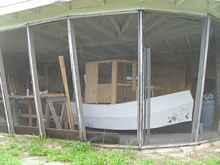 Now back to our regular program. The boat has moved! Sorry no pictures, but it was not as bad a job as I expected. It only took three men and a moderate amount of effort. Use the block and tackles to hoist on its side then pushed to the screen. Set down on its side and moved the block closer to the exit. Lift again and slide out the screen. Slide across the grass in line with the trailer, then up on the bunks.