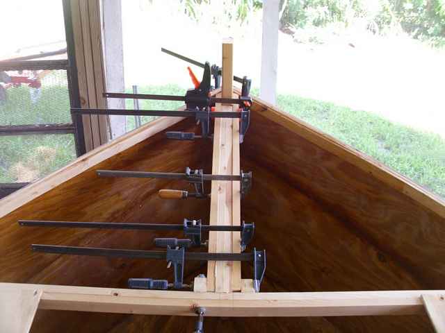 Laminated 1x3 slats to a 2x4 for the bow post, back to station 3 for deck support. Additional support will be added at sta. 2. |