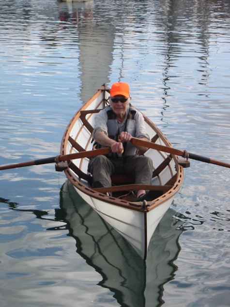 Last week the second LFH17 got launched. Now have a few minor details to work on and row it. A few construction details changed. Added another stringer between old garboard stringer location and bottom, only "notched" frames 3/16" for the stringers, omitted 1X4 cross pieces and added "bridged" framed at #1 and #5. And reduced stringer size to 5/8th with rounded edges. All this brought weight down to #55.
