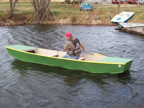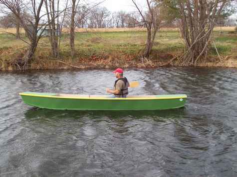 The whole intent of this exercise was to get a lighter smaller boat that I could paddle like a canoe but hopefully still carry a load like a Jon Boat. I splashed her in my pond and what little I got to play in her she seems to fit the bill. I can easily reach either side to paddle and she is very stable even with vigorous rocking side to side. We will see what kind of load she will carry this spring when I float my favorite rivers again. Thanks to Jim for a great design and to Duckworks for the supplies.