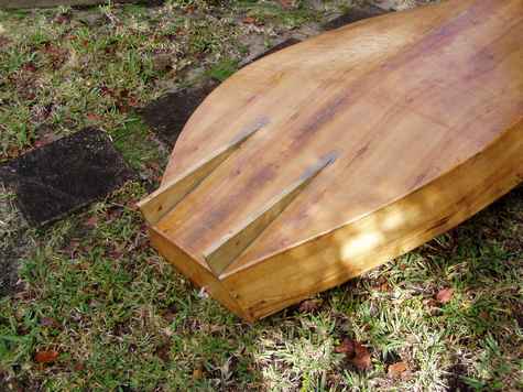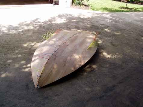 First I start with line drawings then paper models then onto the Luan. Lots of cutting, twisting, plastic ties and epoxy made an awesome shape. The result is a fine looking craft 88 inches in length, with a 44-inch width. After sea trails twin fins were added to the stern to help straight-line motion.