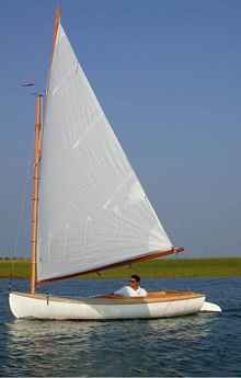Most people think of a catboat as one that is a very wide flattish bottomed boat with a big gaff mainsail fitted in the bow and a barn-door rudder. Here's an example.