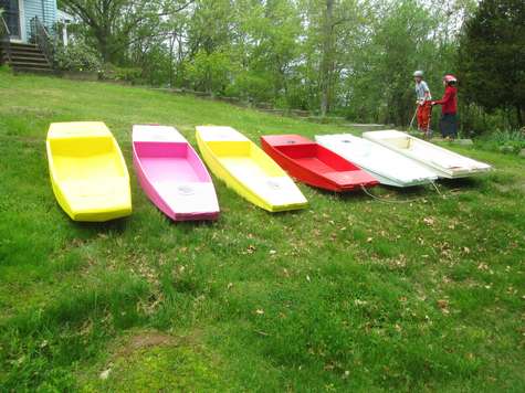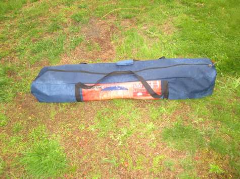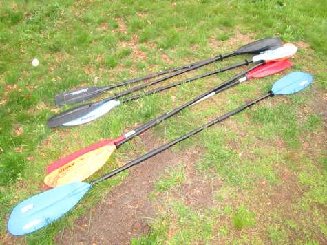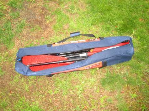 With the fleet I've built the amount of equipment multiplies rapidly, driving home again because we're short on paddles life jackets or cushions is no fun. Neither is trying to carry an armload of paddle sections at once. Like most people I've had more than one easy up type picnic awning taco (fold up the wrong way) on me (avoid the pain, only buy a commercial grade easy up, they cost more and weigh more for a reason, they aren't disposable). After the easy up frame tacoed I saved the fabric top and the bag it came in. At some point I discovered the bag is long enough to fit canoe or kayak paddles. At one point we had a blue bag for kayak paddles and a green bag for canoe paddles (this makes it easy to tell little helpers what bag to grab. The canoe has since been sold so right now I'm down to just one bag for paddles. We also have one of those large yellow bags with a velcro seal for life jackets, this keeps getting ready to go boating much easier to organize and delegate. As long as both big bags make it the rest is up to what each person wants to bring, (or remembers to).