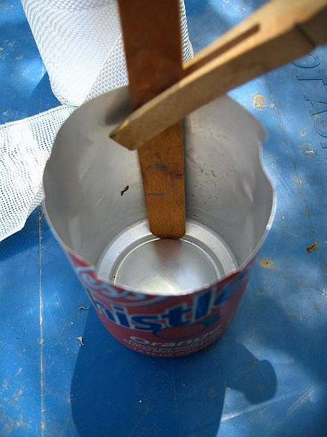 "A soda can has its top cut off to make a straight sided open container. The stick has marked on it a line 1" from the bottom and again "1-1/2" from the bottom. Then the stick is clamped to the side of the can with its bottom all the way down to the can's bottom. Then I fill with epoxy resin to the first mark. Then the hardener goes right on top of that to the second mark. This gives the 2:1 mix ratio this hardener requires but if you have a different ratio to work with you just remeasure those lines to suit."