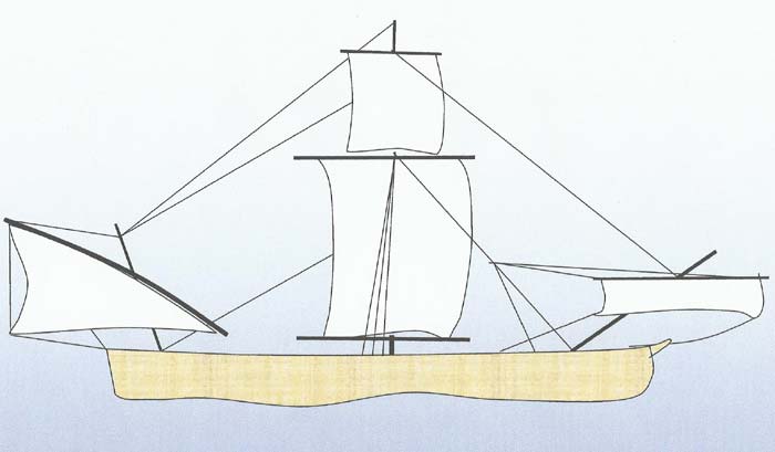 Now this is a boat with intrigue. The saique mizzen is long, leaning lateen, the main mast hold tall square sails, and the bowsprit has this low puffer. Does this mean the men who handled the lateen can't stand the men who handle the square sails and the men who handle the bowsprit sail don't like either of them? Why are they so far apart?