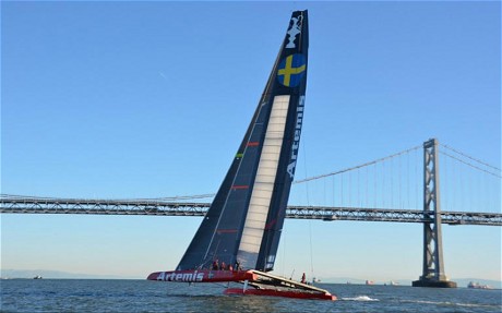 But the real brouhaha is about the safety of these damned sail-gliders. To get to 40 knots, very little boat is in the water. Sir Keith Mills cancelled his British Team Origin campaign in 2011 over safety. These boats are designated, AC72; one of them pitch-poled in October 2012 after only 8 days of sailing in San Francisco Bay. The boat, damaged into pieces, was drawn out of the bay by tides on into the Pacific.
