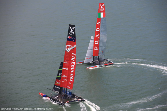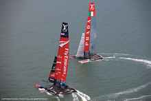By the way, each of these sail-gliders costs $100 million - why not just glue two San Francisco Pelicans together with a tarp sail and get on with the racing?