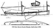 These were sharpies, a hard-chined long narrow flat bottomed sailboat with centerboard and straight, flaring sides. They may have originated in New Haven CN, where they were used for fishing and oystering. They were easy to row, sail and build. Everything about them was long and shallow.