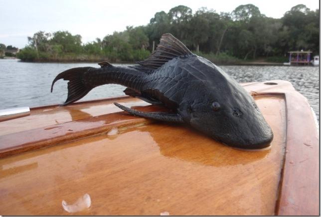 These things wash up on the beach once in a while and scare the women, children and Steve. It's a giant Placostamus, the little tropical fish you put in your fish tank to clean the glass. As you can see, in the wild they get big and ugly. We try to get of dead fish off of the beach before the dogs find them so they usually end up on Chelsea's bow to be dropped off on the way home for the crabs to eat.