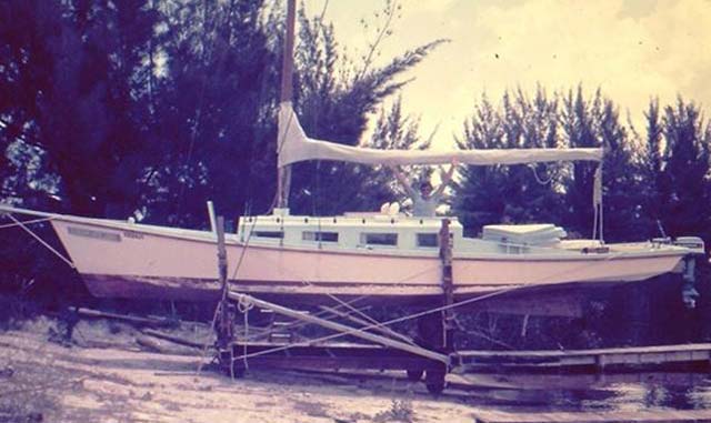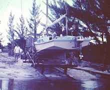 Here she up on the railway. You can see why this hull shape would surf. Everyone at the Tampa Sailing Squadron enjoyed this boat, she was perfect for rafting up along side and the giant flat deck and cabin made a good gathering place.