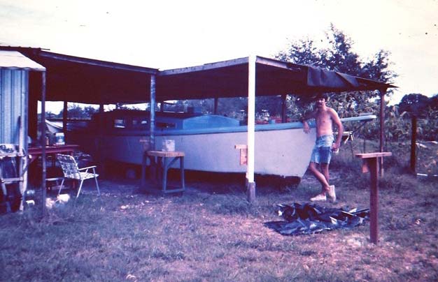 The plans call for a hull 36 feet long and 10 feet wide, ours ended up 37 by 10 with a three foot long bowsprit. We didn't have much money so we built the boat light and cheap 2X6 frames and half inch plywood and a very simple interior and no systems of any kind. The only through hull fitting was one drain for the cockpit. Covered the whole thing with fiberglass mat and polyester resin. A big investment was 2000 pounds of steel punches for ballast.