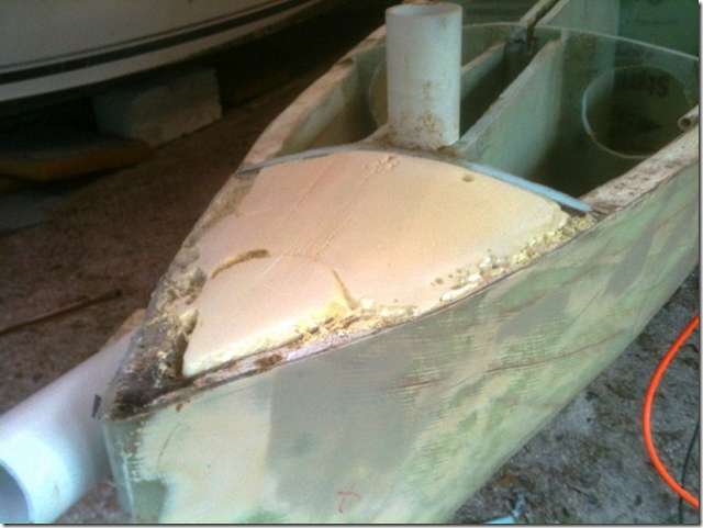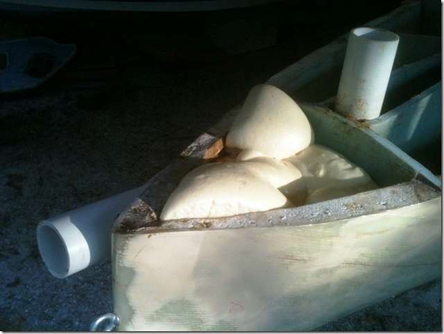 I love playing with expanding foam. This stuff says it expands 30 times and it's really fun watching it grow. I'm filling the front and back of the EC boat and am having a hard time holding back from doing the whole boat. It's closed cell and approved by the Coast Guard for flotation, it's 2 pound foam. It costs about $75 for two gallons of this stuff which should make about 10 cubic feet, I think.