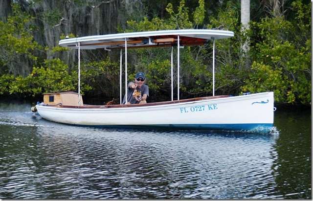 Charles Hodges did come to see us. He's from Georgia and built this launch from some modified Bolger plans. I think he said that it's 34 feet long. The truly unique thing about this boat is that he controls everything with a controller of a PlayStation. Everything has a servo running it so he can walk anywhere on the boat and still be in control. Would you imagine that he's a radio control airplane guy? He and his wife were here a couple weeks ago the same time as Chuck the Duck and Sandra. They both talked for a while, had a lot in common and left not knowing who the other really was. We get a lot of that here. If you come for a visit you may be sitting on the dock swilling beer with the king of the universe and not know it; braggarts and jerks get pushed in the water and leave.