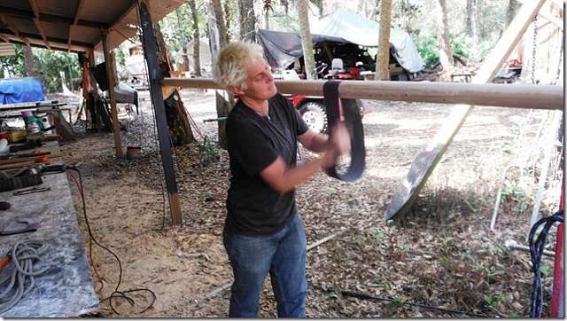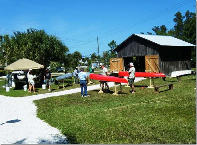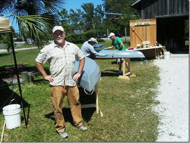 The Florida Maritime Museum had a class on building skin on frame kayaks and got Dave Gentry to teach. This is Dave himself. If you need your frame skinned Dave's your man. I took this picture two days ago, notice the weather. I only mention this because Dave came down from somewhere on the Chesapeake Bay and they were having a blizzard with a foot of snow on the ground. His wife won't let them move here because it's too hot in the summer. I love to hear that, we're getting too crowded as it is.
