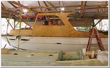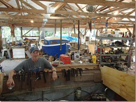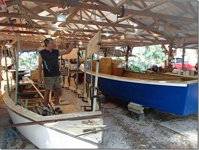 Everything ends up being "repurposed" if it comes here. This is an old Lightening sailboat hull that Wally's converting into a cabin motor boat, I jumped in to check the height of the sides. Notice that I've switched to the summer uniform. We all get really upset if anyone tries to give us any advice; and besides how the hell could you give advice on any of the strange boats taking shape here at the happy hour club. Only the builder has any idea of what it's suppose to turn into and that changes daily.