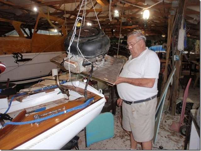 Here's Chelsea getting some "warranty" work by Howard. It's been a couple years since it's had any engine maintenance and needed it's belts tightened, an almost overwhelming chore to the rest of us but a simple half hour project for him. He had the motor unbolted and hanging in the air in ten minutes. This is the Briggs and Stratton engine that's been in daily use in the salt water for almost five years, looks better than the one in your lawn mower. Whatever they're make out of sure resists salt corrosion.