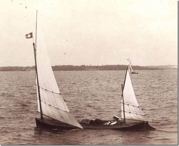 That's not the Everglades Challenge boat we're making but if you've wondered where he got the basic design for that boat here it is. In 1886 this sailing canoe sailed across the English Channel and kicked butt on a lot of French boats of all sizes. Our boat looks almost exactly like this with the addition of a long bowsprit and a big roller furling jib for reaching and running. John knows exactly what he wants and won't let me deviate much from the picture he has in his head. He never lets me forget that I told him that if he designed it I would build it. He treats me just like my sons do, no respect.