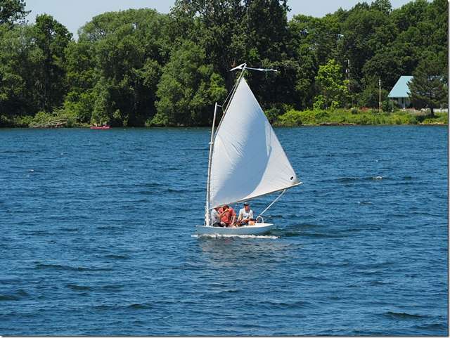 This looks familiar doesn't it? Crazy Steve standing around with a cup of vodka in his hand, even the Canadians couldn't stop him. He and Lenna are up at their place on Wolf Island on the St Lawrence river right now. He took his new sailboat with him and is having a ball with it, as seen here with two more boozers out in it with him. The drinking water for all these places comes right out of the river with no treatment. The Lee sail man is looking for a picture of one of his sails, here's one, notice the lack of battens for a perfect shape.