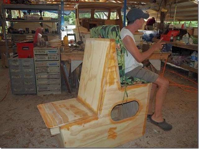 Crazy Steve's trying out one of the seats while giving some of his rarely informative and always useless bits of information about a distant Canadian relative. Or maybe he's talking about the slug who's supposed to be finishing this ocean racing canoe. I did make some cool looking hatch covers and it only took six months; maybe I should go back and read that bit of advice on how to finish a project.
