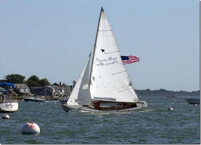 In case you're wondering, here's the first "Proud Mary"; a big over canvassed centerboarder. This is right up there with the best of them as far a being a beautiful boat. I'll tell you what it is as soon as he tells me. Richard must really know what he's doing to drive this beauty rail down through a fleet of moored boats. Either that or his main sheet got jammed and he's hanging on for dear life hoping not to luff up into anyone.