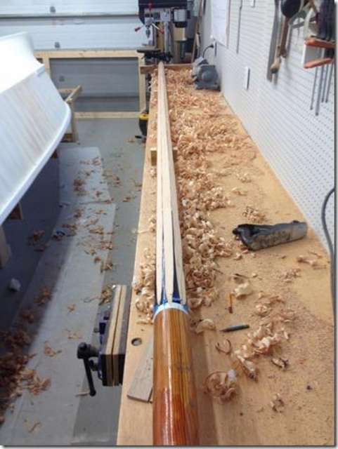 Someone was finally smart enough to buy the best 16 foot Melonseed ever built. This is the one with the foam hull that is indestructible. Here you see me and Laylah trying to sink it. It's mast was a little to fat so Fland's taking it down to the proper size, three inches at the bottom and two at the top. He's going to have so much fun with this one; I can see him surfing it in on Jacksonville Beach.