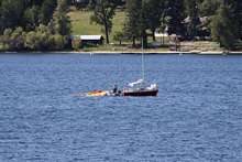 One minute he was hiked out and accelerating. Next, the rig was in the drink. A local friend with a fancy waterfront house snapped these shots and sent 'em to me email. The moment the other boat got dismasted, the old Boy Scout juices started flowing. We were doused and motoring over in less time than it takes to say "Be Prepared." No big deal. I've been towing people home for a very long time now. But, there we were framed in Dick's telephoto lens. Directly in front of the Scout Camp waterfront. The very spot I pulled my first sputtering and choking kid from the water. Right where I first learned to row, and paddle, and sail, and water ski. Right there.