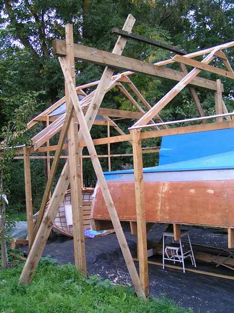 Now what do I fasten it to? Considering the boat shed as it stands, if I lengthen the uprights and put weight on them one of several things may happen: