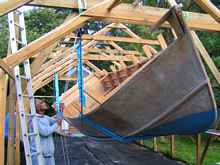 Well that is the structure designed, now what about turning technique. First job will be to detach the boat from its building frame and to place a strengthening support across the hull where the strops will lie, I intend that the strops will sit next to frames, so a cross piece will be needed to brace the two frames. The slings are intended to hold a load and not allow it to slip, so I will need to wrap them with several layers of thick polythene sheet to reduce the friction. By raising the hull on one side (where the chain hoists are situated) and then fastening the side in place while releasing the hoist, this should cause the other side of the hull to tip. Repeating this process several times should result in the hull turning over eventually. So much for the theory!