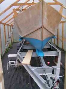 - Build a cradle round the boat with a circular outside profile and roll the boat over. Well to start with it’s going to have to be very solid as I recon the hull must weigh near a ton already. Even if I managed to build the cradle I don’t have the space to roll the hull as my boatshed has concreted-in posts which I want to keep for a while, and if I did manage to turn the hull how do I get the trailer underneath – another major job?