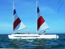 2. Building is lots of fun. Of course, I have always been building…something. I was a building contractor for much of my working life. But even today, nothing seem to make the clock disappear like an engaging building project. And what’s more engaging to build than a boat? 3. If it breaks, you can fix it! This I know from personal experience. Yep, lots of stuff I made in the early days broke -- mostly to do with the rudders. I build things lots sturdier now, but even so, if it breaks, I can fix it! 4. You get great sense of accomplishment. Building anything with your own hands is rewarding. But believe me, a trimaran is MUCH more rewarding to build than a coffee table. And the feeling of being out on the water in something you built yourself is just amazing. 5. Building keeps you off the streets and out of trouble. Well, it does that for me. Of course, if your spouse feels neglected because you spend so much time in the garage or shop, see if you can get them involved one way or another in the construction. Wife Laura is an ace epoxy mixer, and also trims the overlaps at stem and transom whenever I fiberglass a hull! 6. They cost so little to make that you can build two, and sail with a friend! That's what I did, and now my wife Laura is my very contented sailing partner -- and an incredibly competent sailor as well. (And that video of me going 12+ mph in No Commotion? Laura is the one who shot it :) Bottom line: Building your own small trimaran simply gives you the most bang for the buck! Added Note: I Am Now (Finally) Able To Offer Building Plans! Since this article was first sent to Duckworks, plans have been completed for Slingshot 16, an improved version of Laura’s Boat, as seen on my web site (www.DIY-Tris.com) After not being able to fulfill the many requests for plans for Laura’s Boat, I teamed up with CAD whiz Andrew Walters and am now proud to offer what I believe to be some truly first-class building plans. If you have any interest in building a quick and nimble small trimaran, you can get full plans for Slingshot 16 here at Duckworks. And if you’d like FREE study plans for Slingshot 16, simply send me an email here with “FREE Study Plans” in the subject line, and I’ll get them right out to you! Here’s a video of one of my first small tris, No Commotion. Happy sailing, “Trimaran” Frank
