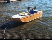This is another photo of the boat just sitting in the water. Again, it looks aft heavy. The battery was relocated after this photo was taken. Next, it's out on the water for more testing. |