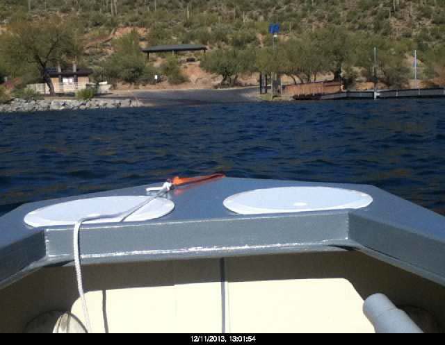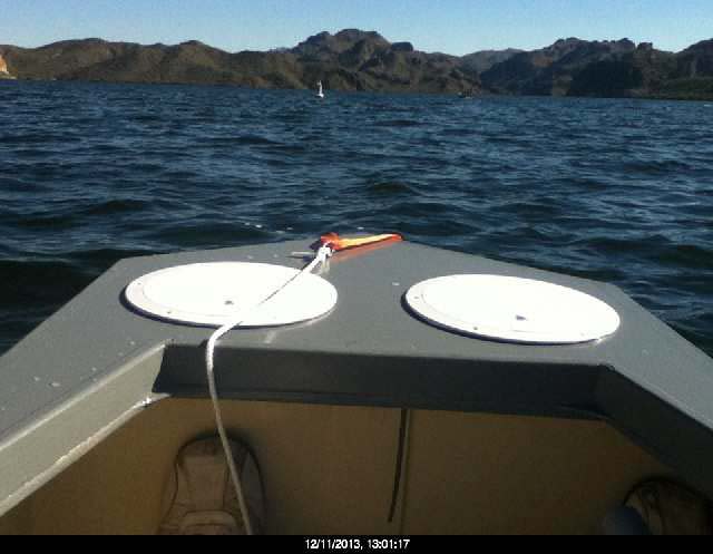 Easy One is sitting alone in the water, and first glance indicated the hull is already aft heavy. I will relocate the 45 pound battery to the front, prior to further testing. Today, December 11, was a beautiful day, with temperatures in the low 60's. Love Arizona! |