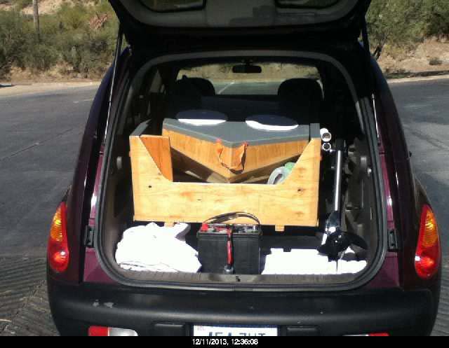This is the Easy One loaded in my PT CRUISER. As you can see, everything fits. Trolling motor, battery, seat, paddles and a bail bucket with sponge. After all, this is the maiden voyage, and you never know what to expect. |