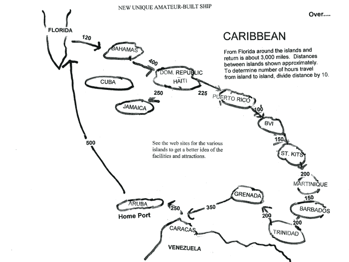 The ship will be based in Aruba, which is out of the hurricane zone and will travel the Caribbean Islands with frequent layovers to enjoy each island's attractions. The ship has a range of 2,000 miles, but bladder tanks may be used to travel to other areas such as the Mediterranean.