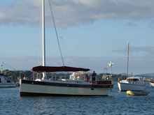 "Ellie" is a Beachcomber Dory with the stern built as a conventional transom rather than the traditional long overhanging tombstone stern. She's fast, the crew here are just picking up to sail out to the start line for their race, while the main is not yet sheeted on just see how well that jib is set. |