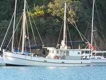 Yes it's a power boat, but this is one of the nicest fishing boat conversions that I've seen. The capacious deep hulls have huge space below, but are still very efficient at moderate speeds, this lovely old ship would only need a small engine now that she is not dragging a net and will be a very comfortable cruiser capable of very long range cruising in any conditions. Note that of that forest of masts only the small one on the main cabin top belongs to the boat we're discussing here, that's her steadying sail, set to take the edge off the roll when the sea is on the beam. |