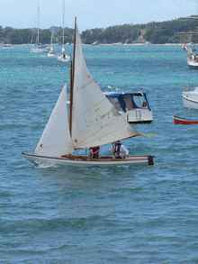 An "L class Mullet boat". The absolute opposite to "Bootlace", these 22ft long centreboard racers with their enormous rigs have their roots in the shallow draft fishing boats that fished the upper reaches of Aucklands harbours on the incoming tide. When they had their catch they'd race for home, the first boat in getting the best price so speed was a real advantage. Over the years the racing became more and more competitive until the boats became racers more than fishermen, and although there are other classes the L class 22 footers are the ones that still compete. That said, I began my sailing career in a "V" class 18 foot Mullet boat of which class there are a very few around, and I know of one "H" class 26 footer. The "Lipton Cup" for which the 22 footers race is one of the oldest sporting trophies , check out this article here. |