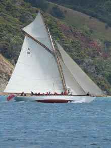 In front is "Thelma", the largest yacht built by Aucklands Logan Brothers, famed for designing and building some of the fastest yachts of their day. Thelma was launched way back in 1897, she's had a chequered history but today is in the care of a trust who maintain her in very much the condition that she was in when launched. Here is a link to her "page".