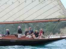 "Thelma" under full sail. Although these old cutters, this one 117 years old, wont plane like a modern high performance yacht they are no slugs. With that huge sail area, relatively light displacement and high ballast ratio they get up to hull speed and a little beyond very very quickly. |