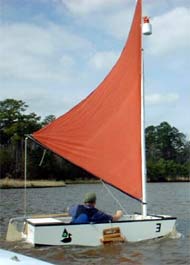 | Shorty used titebond glue and lightweight chines and carried a stock 59 sf Bolger sail. His leeboard is mounted low in an exterior slot. He modified the rig by changing the sprit to a boom – no bad tack. |