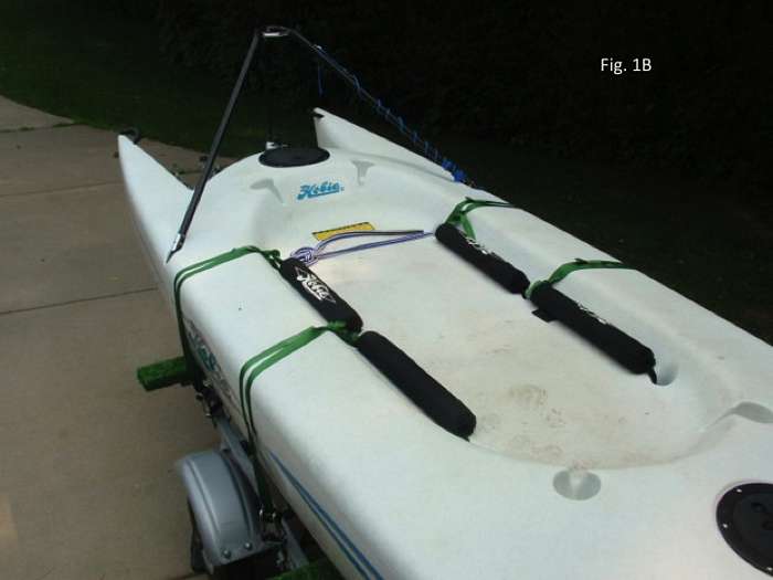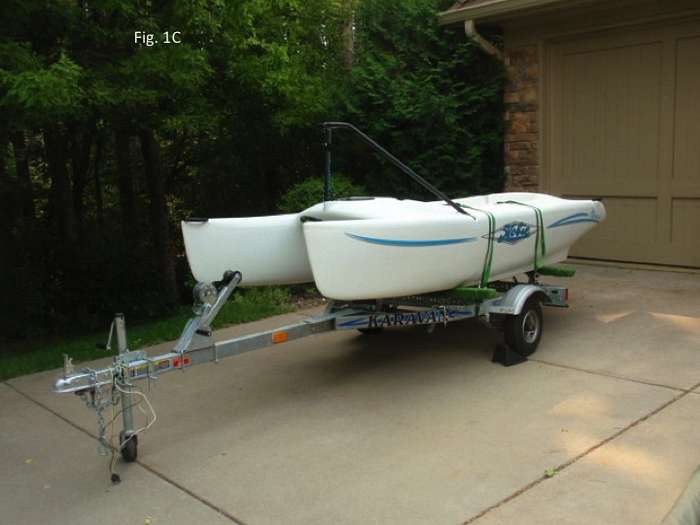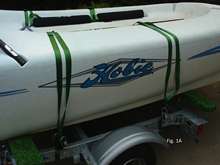 This new knot modifies the regular truckers hitch in a few ways to get both pulley and ratchet action. In Figs. 1A, 1B, and 1C, the Hobie Bravo is on its trailer, ready for the sail bag including mast and sail to be secured to the hull. Four green ratchet straps are used to hold the Hobie Bravo on its trailer. Each strap is looped around a hull through a scupper hole in the cockpit.