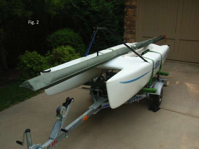 In Fig. 2, the sailbag including mast and rolled up sail is placed on the hull. In this picture, the mast is just sitting on the hull and has not been secured yet. Using the ratcheting truckers hitch, a pair of fore and aft lines will be used to secure the mast on the hull.