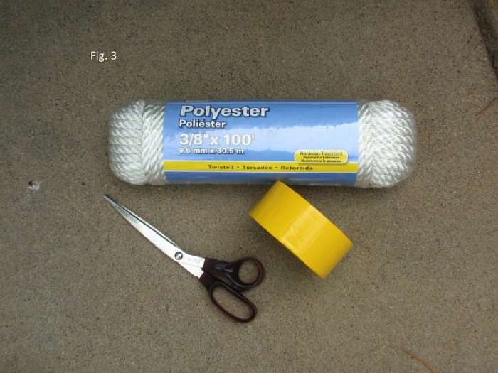 For initial set up, the line and tools shown in Fig. 3 are used. The line is 3/8 polyester with 280 lbs break strength. With knots, the line break strength likely is half that. I am not sure if this polyester line will be ultraviolet stable in the sun yet. So far so good. Also shown is duct tape and shears. The duct tape is wrapped around the line where the line will be cut to length. This is a fast and long lasting way to keep the line from unraveling after it is cut.