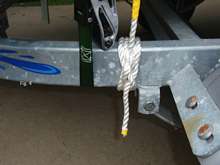 It’s worth the effort. See how to make the boom hitch. The line heading up from the boom hitch is the working end. The line hanging down is the port side tail. The yellow tape on the bottom of the tail protects the short tail from unraveling, which is now trimmed to 3 inches long. The yellow tape just above the boom hitch is on for reference. If I ever take the hitch off the trailer, the yellow reference tape shows me where to position the line so this end is long enough to make the same hitch again. IMPORTANT: The tail should not be more than 4 inches long and must not be able to reach moving parts of the trailer. If longer, the tail needs to be cut shorter or securely tied off somewhere not near any moving parts.