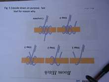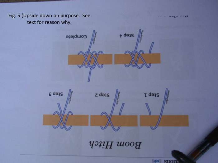 Fig. 5. I used the step by step instruction sheet in Fig. 5 to help me tie the boom hitch. Fig. 5 is upside down, but that’s how I want it. I flipped the instruction sheet upside down so that the hitch shown in the guide is in the same orientation as the way the line runs on my boat.